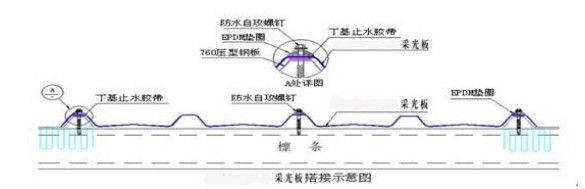 3. 采光板與鋼板在縱向搭接時,最小必須有200mm的重疊,并貼置兩條止水帶。